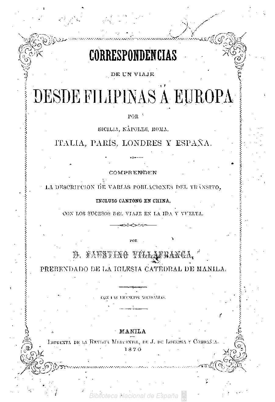 Correspondencias de un viaje desde Filipinas a Europa por Sicilia, Nápoles, Roma, Italia, Paris, Londres y España comprenden la descripción de varias poblaciones del tránsito, incluso Cantón en China, con los sucesos del viaje en la ida y vuelta
